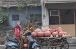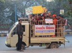 The next morning I encountered a woman selling her wares to a local on a motorbike. I watched the older woman push her cart through the streets until she found a suitable location. Right outside our hotel gate was this colorful holy man waiting to cross the street and and along the way passively soliciting money for his copper pot. Not far from him, sat a truckload of young men enthusiastically looking for work.