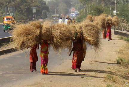 All over India there are brightly colored and decorated trucks called Goods Carriers. And all over India there are women with various provisions balanced atop their heads. It’s amazing, really, if you look at the picture, there is no other way these women could have carried this amount of straw without some sort of cart. And the water they carry on their heads would be too heavy to haul in their arms, but the human body and spine is so strong it can almost easily accommodate the weight. Strong women. In many respects.