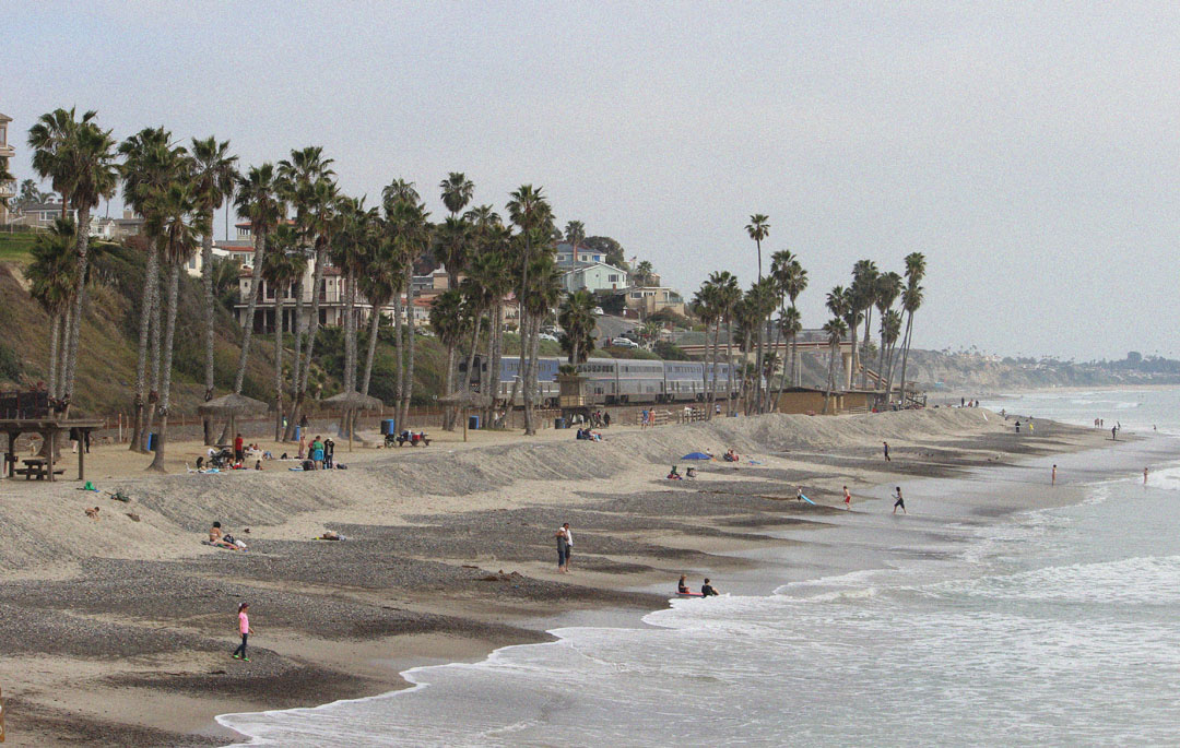 San Clemente: It was a grayish day in San Clemente as my brother, niece and I strolled along the pier. As we walked back toward land I snapped this picture. It reminded me of a painting because of all the elements. There is the train that runs along the shoreline, the people in various states of dress along the beach and in the water, oh-so-California palm trees and the gently rising hill behind it all. I put a little grainy filter on the photo just for fun.