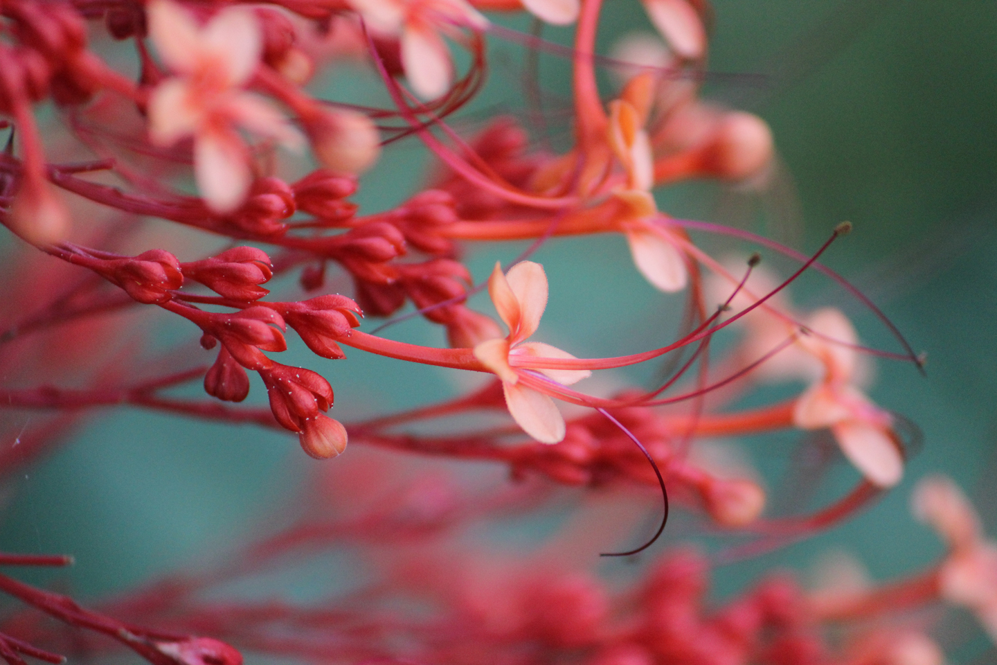 Salt Springs, FL: There are these amazing flowers here, at Amrit Yoga Institute called Pagoda flowers. And that’s exactly what they look like. Tiers of little pinkish red flowers one on top of the other. They rise to about six feet and attract copious amounts of butterflies from tiny and bright yellow to giant, graceful swallowtails. Hidden in the large green leaves beneath these magical structures are dragonflies, tiny spiders, something brown and black that may or may not sting. It’s a whirlwind of activity. But as I tried to train my camera on the moving butterflies all I came up with were colorful little blurs. So I chose just one flower on which to rest my attention . This is the result.