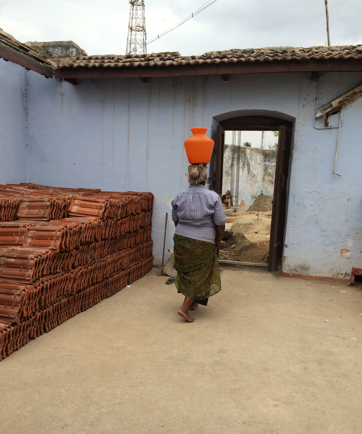 tile from the 1865 roof has been removed and hand washed so it can be reused. We see evidence of this as we make our way outside. A neat stack of tiles is piled against a wall, while a woman sits halfway in a vat of water caressing the dust and years off tiles for future use.