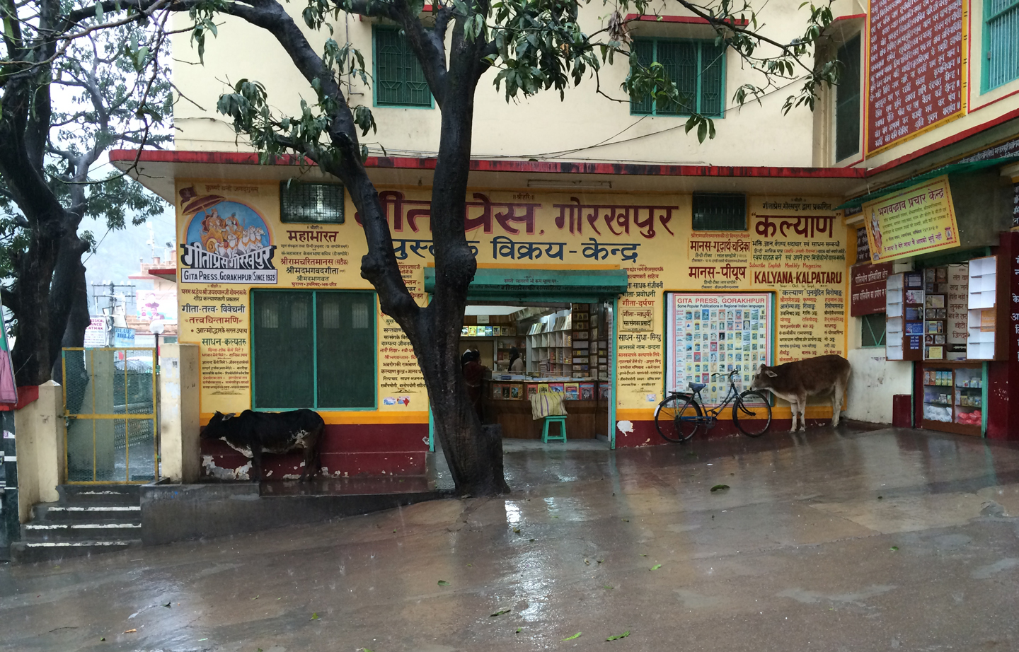 We secure seats along its center, where there’s a better chance of staying dry. As we are being ferried across the great Ganges the tin roof above our heads amplifies the driving rain. By the time we reach the other side it is pouring. Pouring. We run up the steps to the shopping street that is mostly covered by wide awnings. But it’s not exactly as we remember it. The shops we recall are way down, and we just don’t have it in us to dodge raindrops, cows and motorbikes to get there.