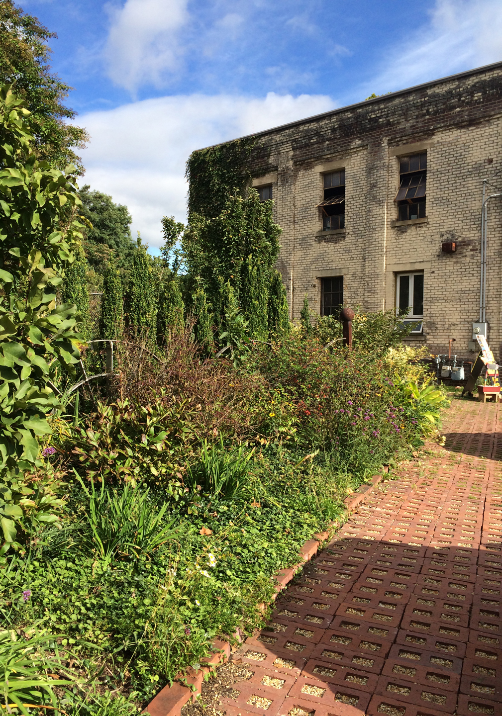 Between the old brick building and the railroad tracks is a small garden with a few sculptures. We walk halfway in, see all there is to see and back out. It’s a lovely place for the folks that work here to take a break, have a picnic.