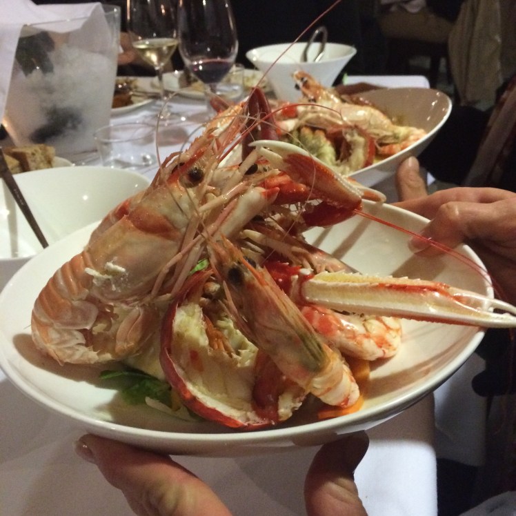 Our dinner reservation is for 9 pm. That’s how they roll here. The menu was minimal but complex. A fish menu and a meat menu with all the courses. I have no idea what I ordered but it is delicious. The folks next to me have crawdads on steroids. Or mini lobsters. Or some beautiful Italian named crustacean. My own meal is risotto with marinara but the marinara has bits of seafood in it and I’m not so much a seafood gal so I spent a lot of time spearing a few grains of rice at a time. But there is wine, delicious reds, persecco, another white. And then there is dessert. 13 individual apple tarts with a scoop of vanilla gelato and a dusted strawberry on top of each. Mine has a candle in its center. Happy birthday is sung first in English and then I am treated to it in Italian.