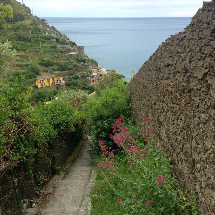 The six of us climb and climb. We pass doorways to mysterious places, vistas of terraced gardens and flowers growing wild in this near perfect climate. Finally we are at a point to look back on the town we just left. It is not the exact view on google or in travel magazines but it is close. And stunning.