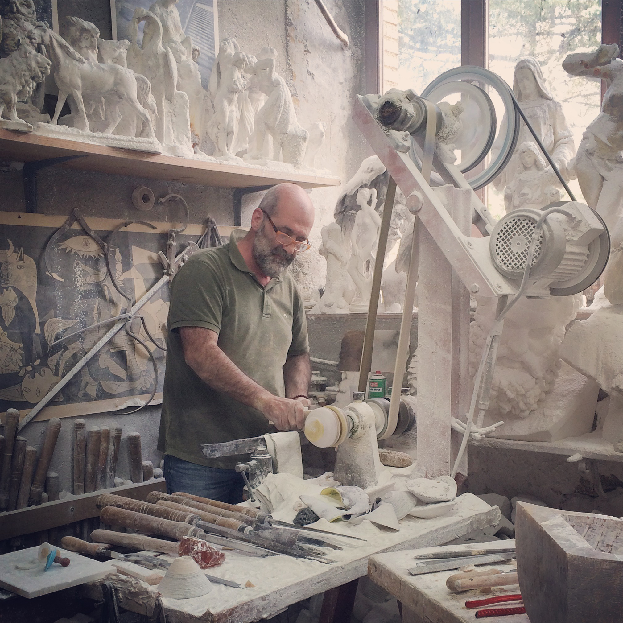 This is a town that is solid. There is so much history here that volumes could be written. It is also a beautiful town today. Alive with restaurants and shops, it is also known for its alabaster.Toward the end of our tour, we are guided down a hill, around a corner and into a light filled space full of glowing white statues and bowls. In the front of the shop pieces are back-lit for sale. The other half of the shop functions as work space. Every square inch is covered in fine white alabaster powder, it’s like walking through a cloud.