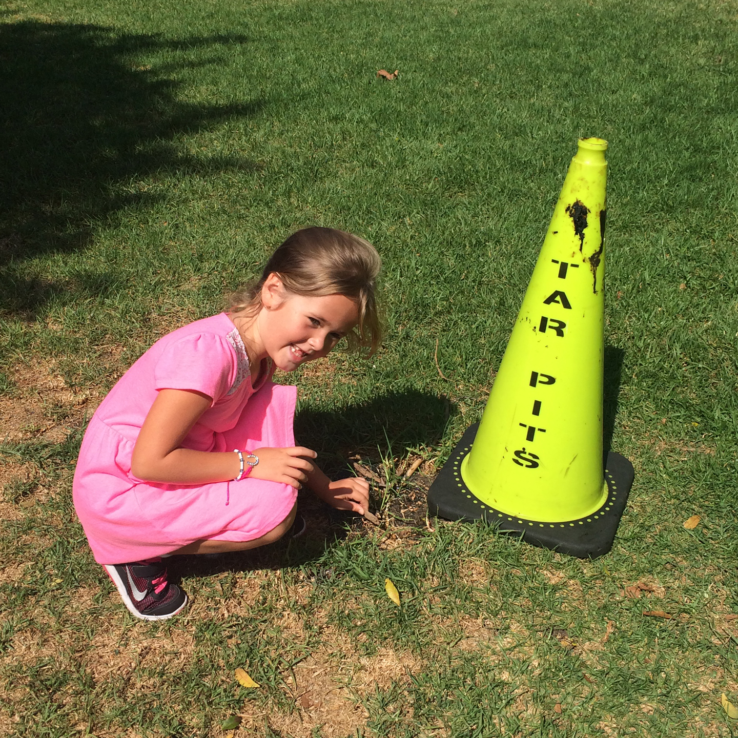 Variously throughout the property are bright green cones covering tiny little puddles of nearly hard tar for kids, big and small, to poke around and coat some body part or a shoe. There is a museum specifically for the tar pits, an amphitheatre where later there will be a Latin jazz concert and a secret space hidden behind a fence.