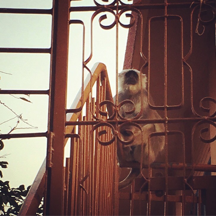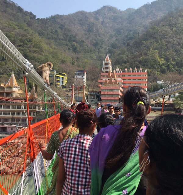 We are guided across a bridge wide enough for two motorbikes to pass one another, yet there are many motorbikes, people walking at varying speeds, many stopping to take photos of one another on the bridge with the mountains in the background – mostly Indians, this is a special vacation place or pilgrimage for them as well – cows, a man pulling a cart full of bags of rice with another man pushing from the other side, monkeys swinging from the suspension wires overhead, and us.